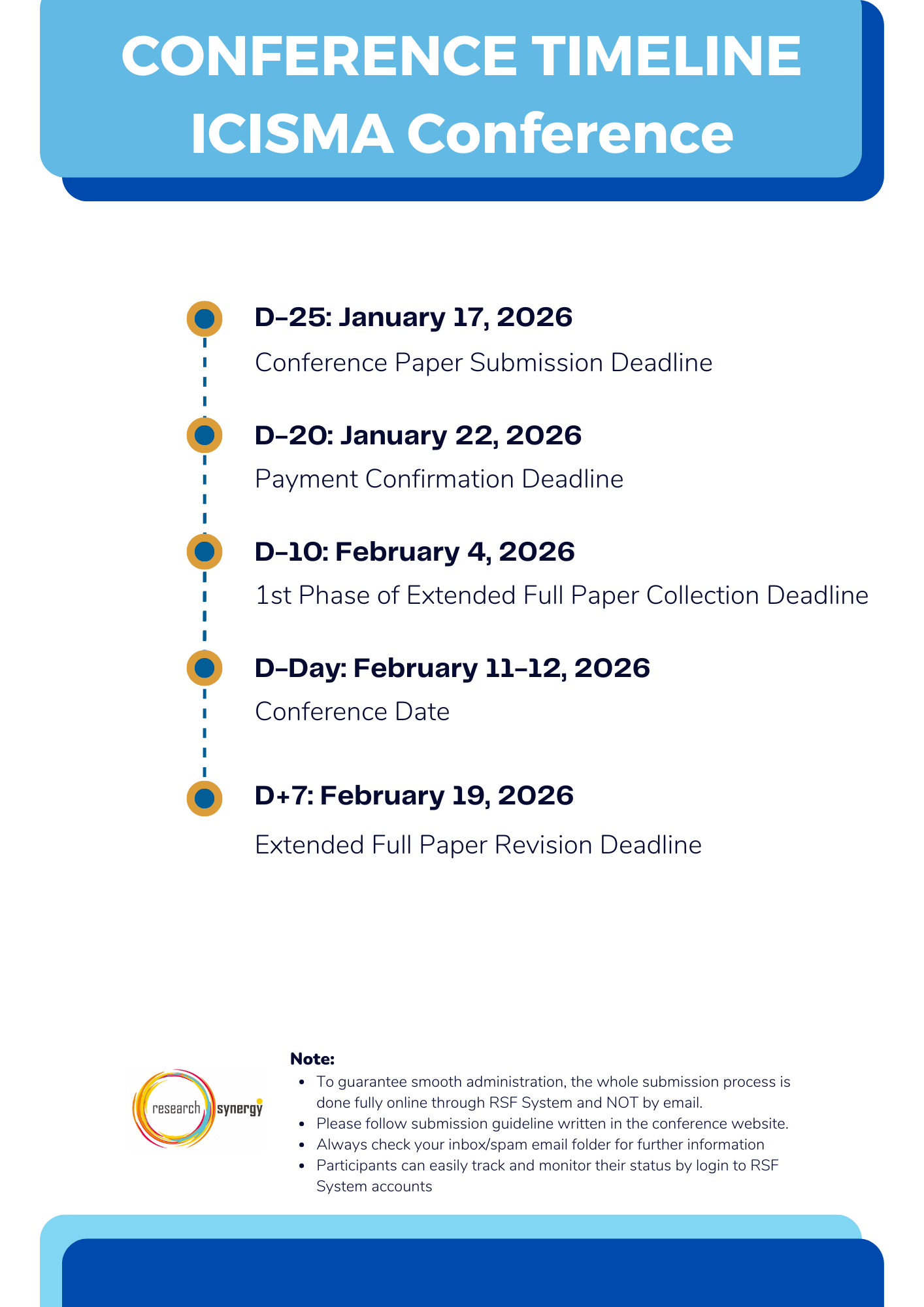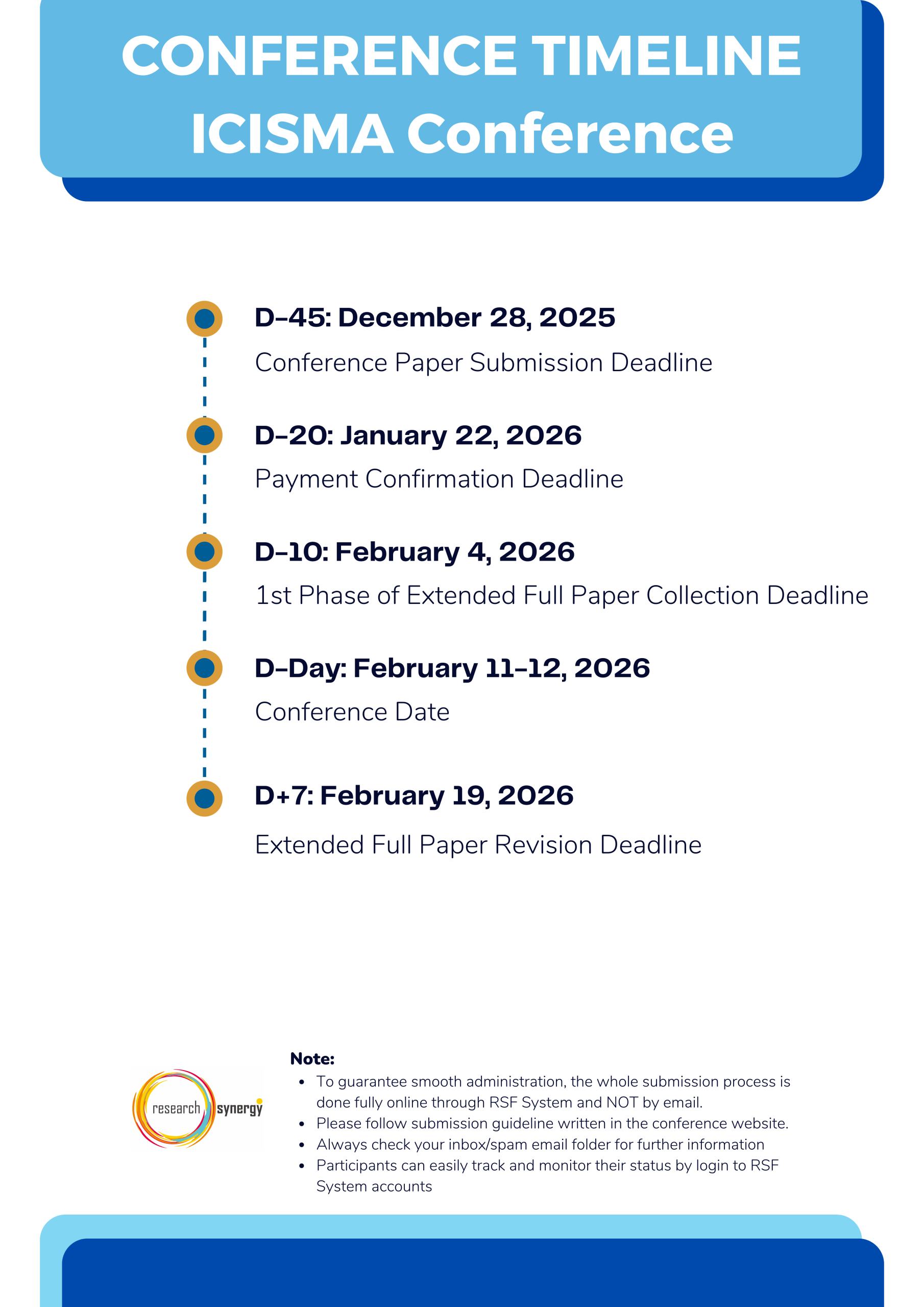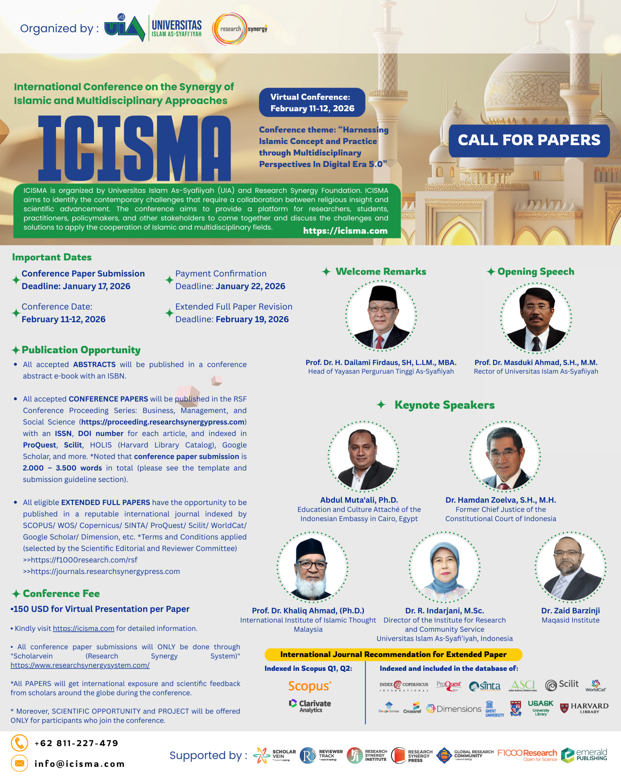 ICISMA is organized by Universitas Islam As-Syafiiyah (UIA) and Research Synergy Foundation. ICISMA aims to identify the contemporary challenges that require a collaboration between religious insight and scientific advancement. The conference aims to provide a platform for researchers, students, practitioners, policymakers, and other stakeholders to come together and discuss the challenges and solutions to apply the cooperation of Islamic and multidisciplinary fields.